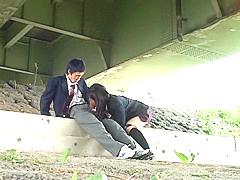野外で甘え合う学生カップルの密着プレイ!顔や制服に…!
